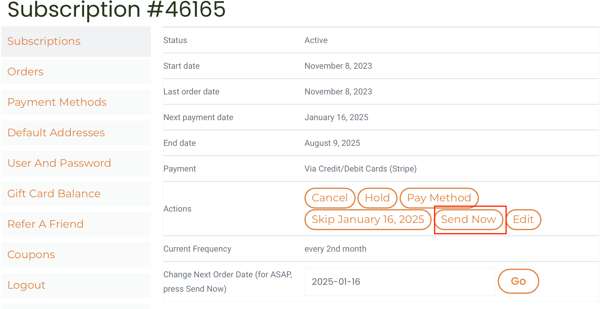 When you are logged in, navigate to your account page and choose the subscription tab. Â Then, on the review subscription page you can see when the next order is scheduled. Â If you want it released ASAP, press “Send Now”. Your next order is immediately placed! Â You will see a confirmation message at the top of the page, and we’ll send an order confirmation email. Â As with all orders, it will be filled and shipped by the next business day.